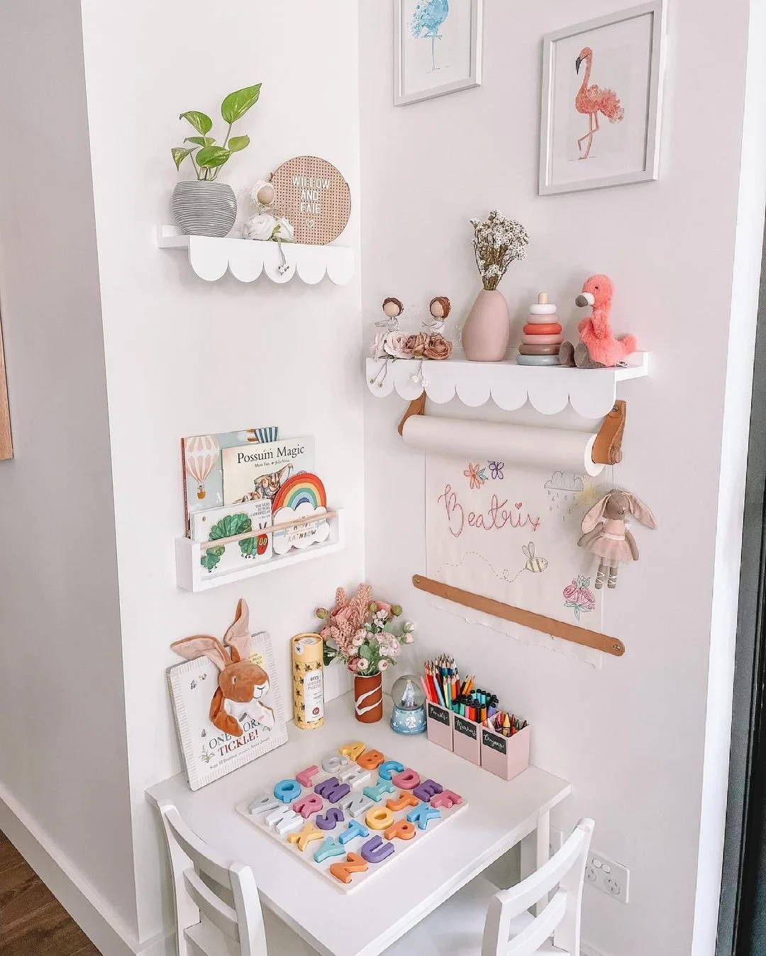 We have found having a dedicated reading zone can be achieved by simply adding some cushions next to the book, a rug on the floor or even a little canopy suspended from the ceiling. Likewise, a block area works best with a table, or flat surface for them to build on. A craft zone is also really important to plan, as there is a lot of potential mess here! We all know what it is like to discover a beautiful mural on the wall with crayon! That’s why we created our Paper Wall Hangers to give children the dedicated space on the wall for them to draw…and hopefully limit their illustrative creativity to that space and not the rest of the house! Combine this with a little desk and shelves to store stationary and you have a simple art zone!