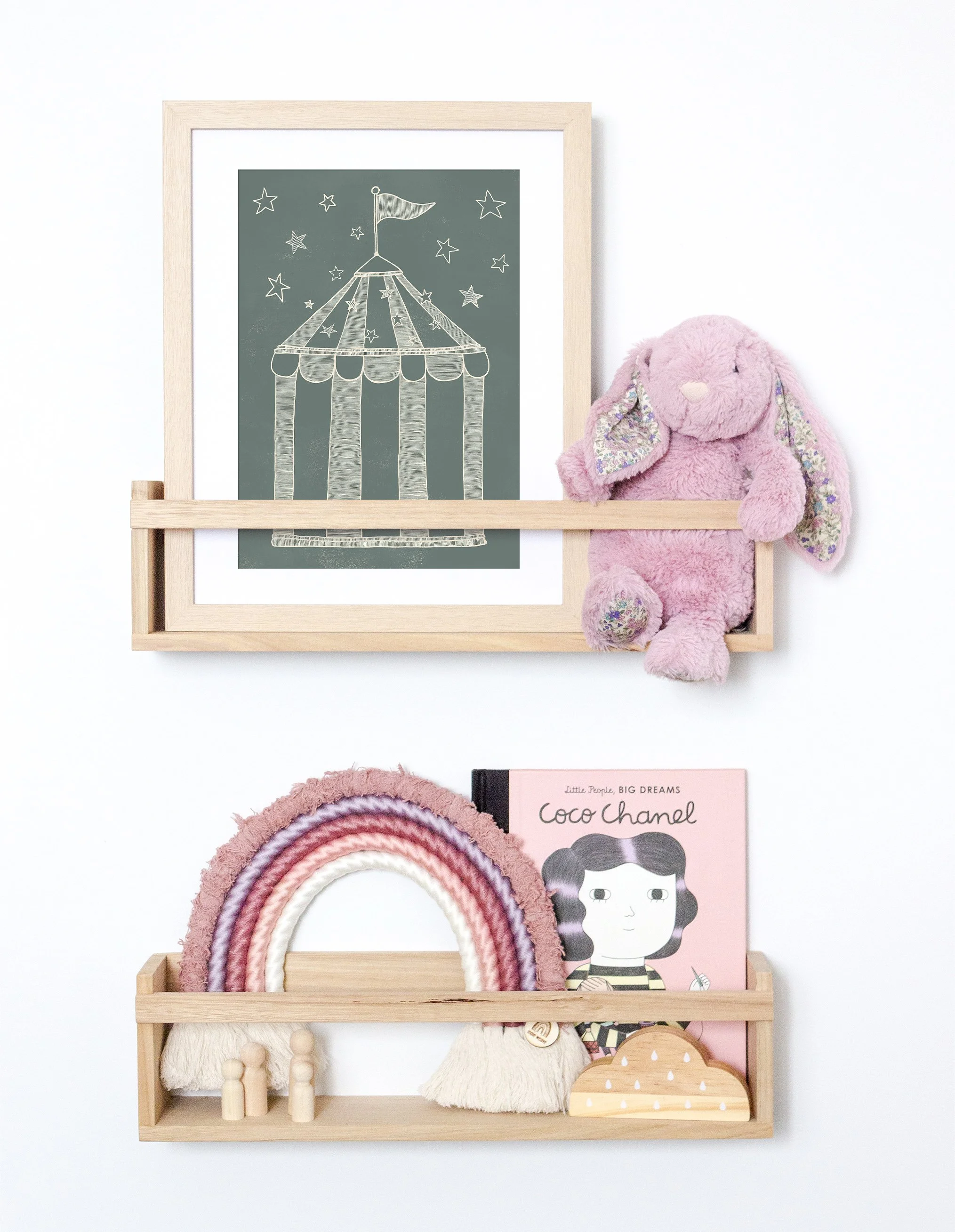 Book Shelves in Raw finish. Also featuring Circus Art print by Ivory Ink Studio