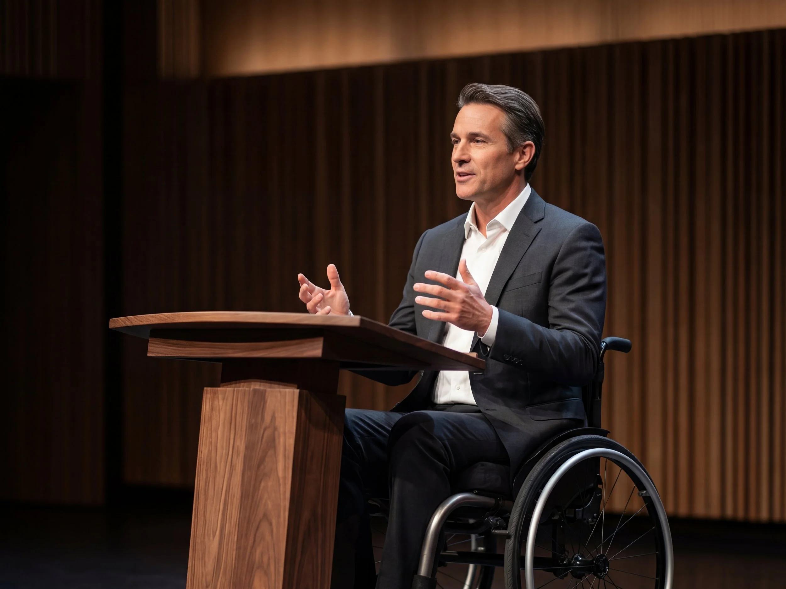 “Having spina bifida, there are days when I am using crutches for my mobility needs and other days when I am in a wheelchair. I love having the easy option of adjusting the height of the lectern for when I am speaking with the simple touch of a button. My accessibility needs are met in a discreet way in this beautiful piece of craftsmanship.”